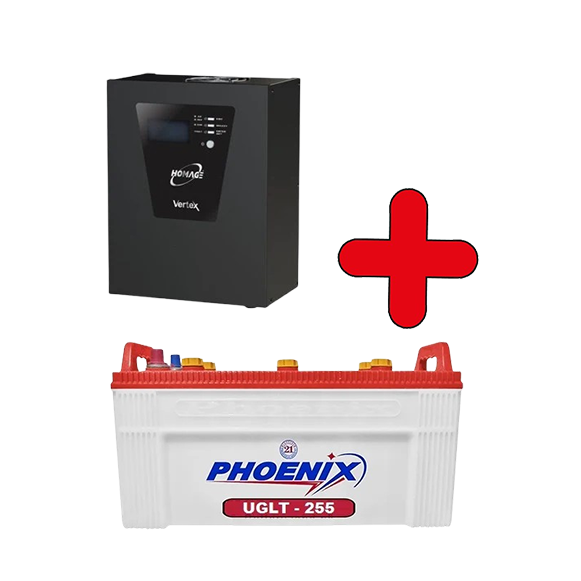 Homage HVS-1214SCC Vertex Solar Inverter UPS 1200VA/1000Watts/12V Phoenix Battery 27 Plates UGHT-255 (200AH), Package (Copy)