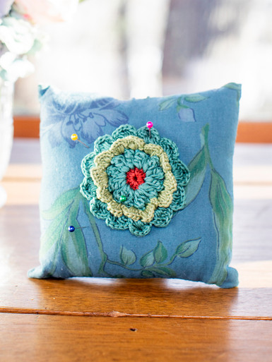Remnant Patchwork Crochet Flower Pin Cushion - Blue